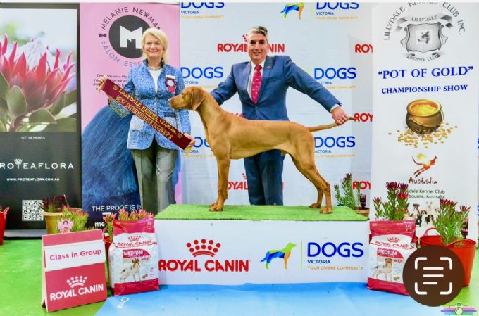 This outstanding Vizsla has made his presence felt in the show ring and is gaining the notice of local, interstate and international judges. He has achieved his Championship title in a very competitive environment and has mutiple challenge wins, best of breed wins, and class in group wins.